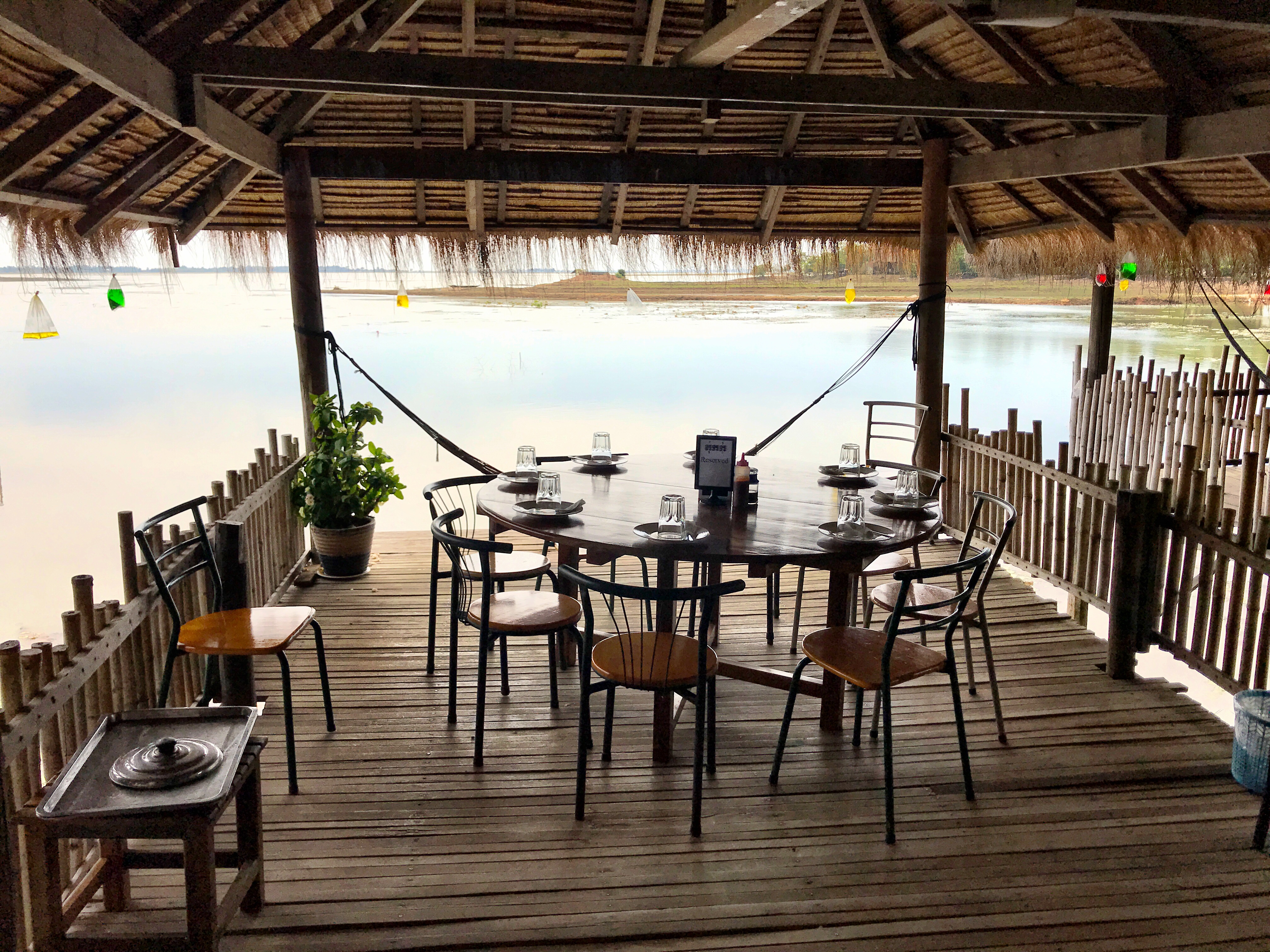 A Cambodian rest area between Phnom Penh and Siem Reap that is the most unusual rest stop I’ve ever been to. We had been in the car for a couple of hours. It takes about 4-5 hours by car to get to Siem Reap from Phnom Penh depending on traffic. Plus, it was lunchtime so I was thankful our driver from BookMeBus.com pulled in for what I thought was going to be a quick stop at a roadside cafe. Boy, was I wrong. My cousins and I walked in to what looked like a regular store and coffee bar in Cambodia. That’s where “regular” went out the window. Wide-eyed we stepped out on the wooden planks of the covered dining area to an unexpected paradise.