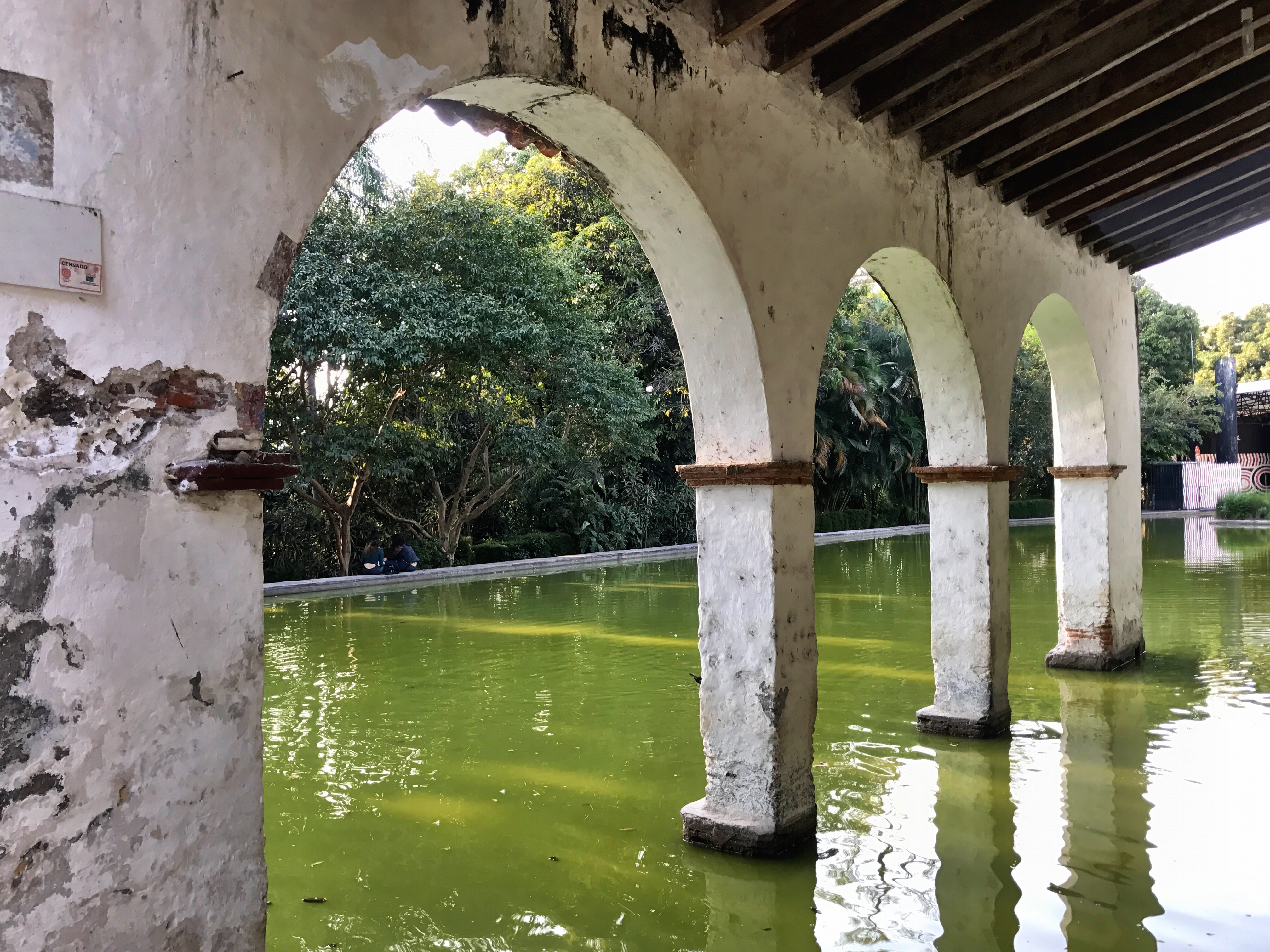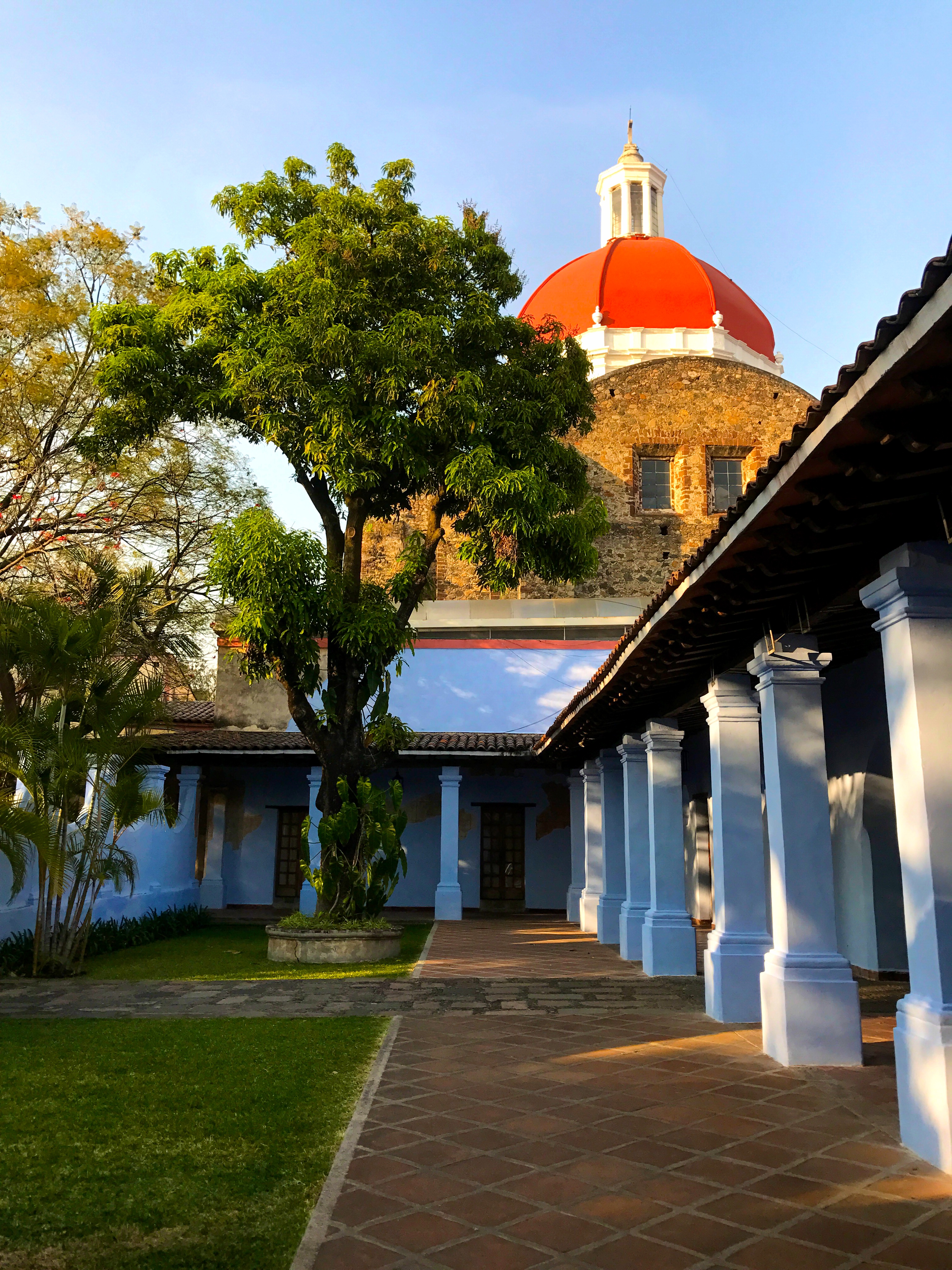 After eating ourselves into food comas, Dempsey, Alma, Alma’s nephew Emiliano, and I headed off to downtown Cuernavaca. We needed to get our walk on after lunch. One of the things I loved as we walked through the city was the colorful banners streamed across the streets. We starting our stroll through the city at Cuernavaca Cathedral. The walled monastery complex of Catedral de la Asuncion, or Cathedral of the Asencion, dates back to the 1500s. It’s one of the oldest churches in the Americas. One of the highlights is a mural depicting Mexico’s first saint. Couple of other interesting tidbits about the cathedral: Cortés had it built to double as a fortress, with cannons mounted above the buttresses and unlike other cities in Mexico, the most important church is not on the main plaza. The rose and ivory facade of the Tercera Orden Chapel (Capilla de la Tercera Orden) is intricate and stunning. Artistically this is the most beautiful chapel in the complex. It was built by Franciscan monk Enrique de Jeres in 1722. The style is Baroque and Churringuersque. When you walk up to it, look closely at the sculptures in the facade to see the angels and saints, some with indigenous headdresses. One of my favorite elements of the design is the curved concave entrance. The chapel is flanked with a the two-story bell tower on one side and seashell formation topping a portal on the other side. I had to take a few moments inside to admire the main alter decorated with colorful flowers, angels and saints. It was constructed by indigenous craftsmen. Before leaving the cathedral complex, I made a quick stop in the Chapel of Santa Maria. From there we headed over to Museo Jardin Borda. In the 1700s, Jardin Borda was a summer residence of Don José de la Borda, a miner from Taxco. When he died in 1778, it was transformed into a botanical garden. During the Second Mexican Empire in the 1860s, Maximilian of Hapsburg and his wife Carlota spent summers in Cuernavaca. As we strolled through the rooms of the hacienda, we enjoyed wonderful pictures captured by famed Mexican photographer Armando Salas. I was so intrigued by his photos of some of the lesser know Mayan ruins. Added a few more places in Mexico, like Palenque and Uxmal, to my travel wish list because of his photos! I loved the architecture of verandas and spent a little time just admiring their simplistic beauty as the sunshine streamed in. We wandered through the gardens over to a lake with an amphitheater. It was one of my favorite spots in the garden. I could only imagine the grand concerts that must have taken place during the time Maximilian was there. It seemed everywhere you turned there was something wonderful to look at including lush plants, beautiful fountains, stairways, and unique architecture. Don’t miss the pools and chapel. I noticed a French influence in the gardens. They were styled after French gardens of the eighteenth century. As you wander the grounds, you’ll likely notice the Versallesco, Mudejar and Italian Baroque architectural styles too. On our way to Plaza de la Constitution, we passed a chapel with stairs on the outside of the dome leading up to the bell tower and then we passed Casa Hildago, where Dempsey and Alma had their rehearsal dinner when they got married. Plaza de la Constitucion was filled with people, musicians, and vendors. Our walking adventure of the city ended at 16th-century Palace of Cortés. It is the former home of Spanish conqueror Hernán Cortés. Now, it is home to a history museum featuring murals by Mexican artist Diego Rivera.