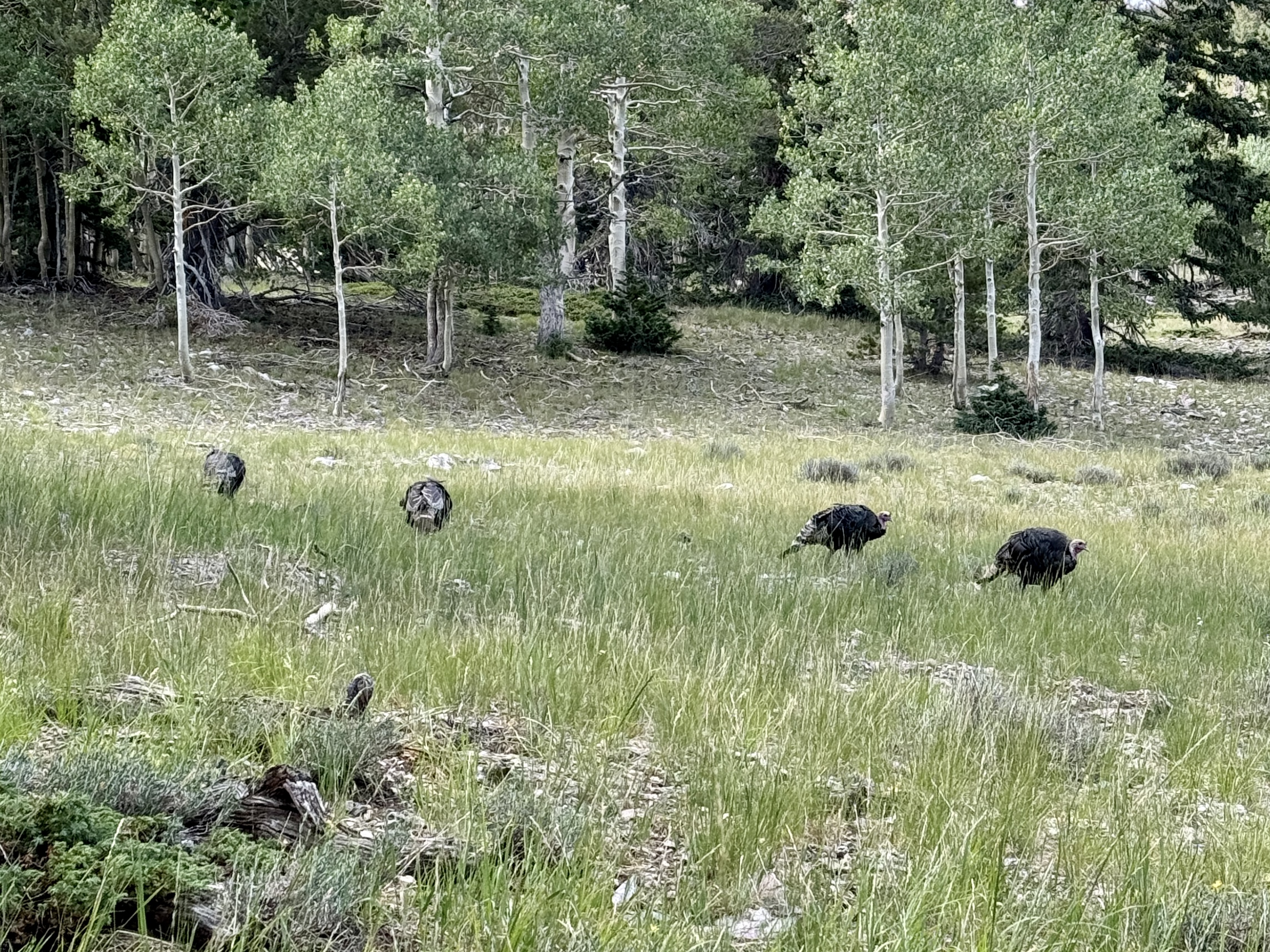 About half a mile in, I paused at a viewpoint with a clear look at Wheeler Peak framed by a weathered, sculptural tree. Shortly after, I spotted two deer grazing quietly in a mountain meadow and some wild turkeys. The trail crosses through the aspen grove and opens into a wide meadow halfway in, where a junction splits toward Wheeler Peak or Stella Lake. Stella is just 0.1 miles off the main route.